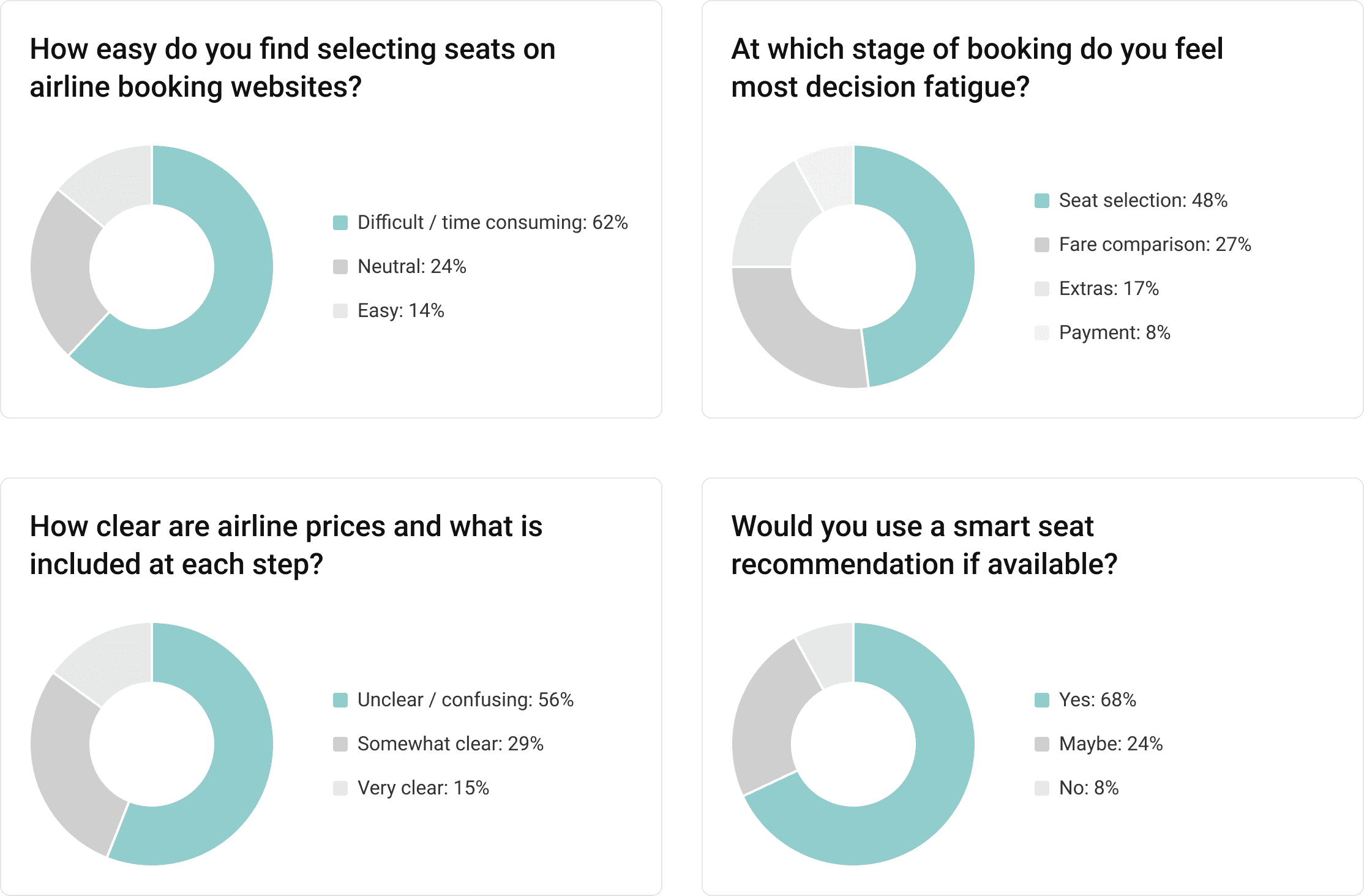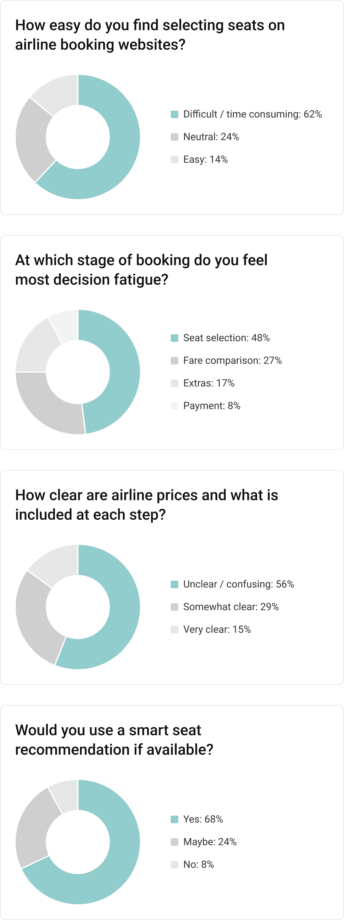 Survey responses confirmed that seat selection and unclear pricing were the biggest friction points, validating the need for a simplified booking flow and AI-Assisted seat recommendations.