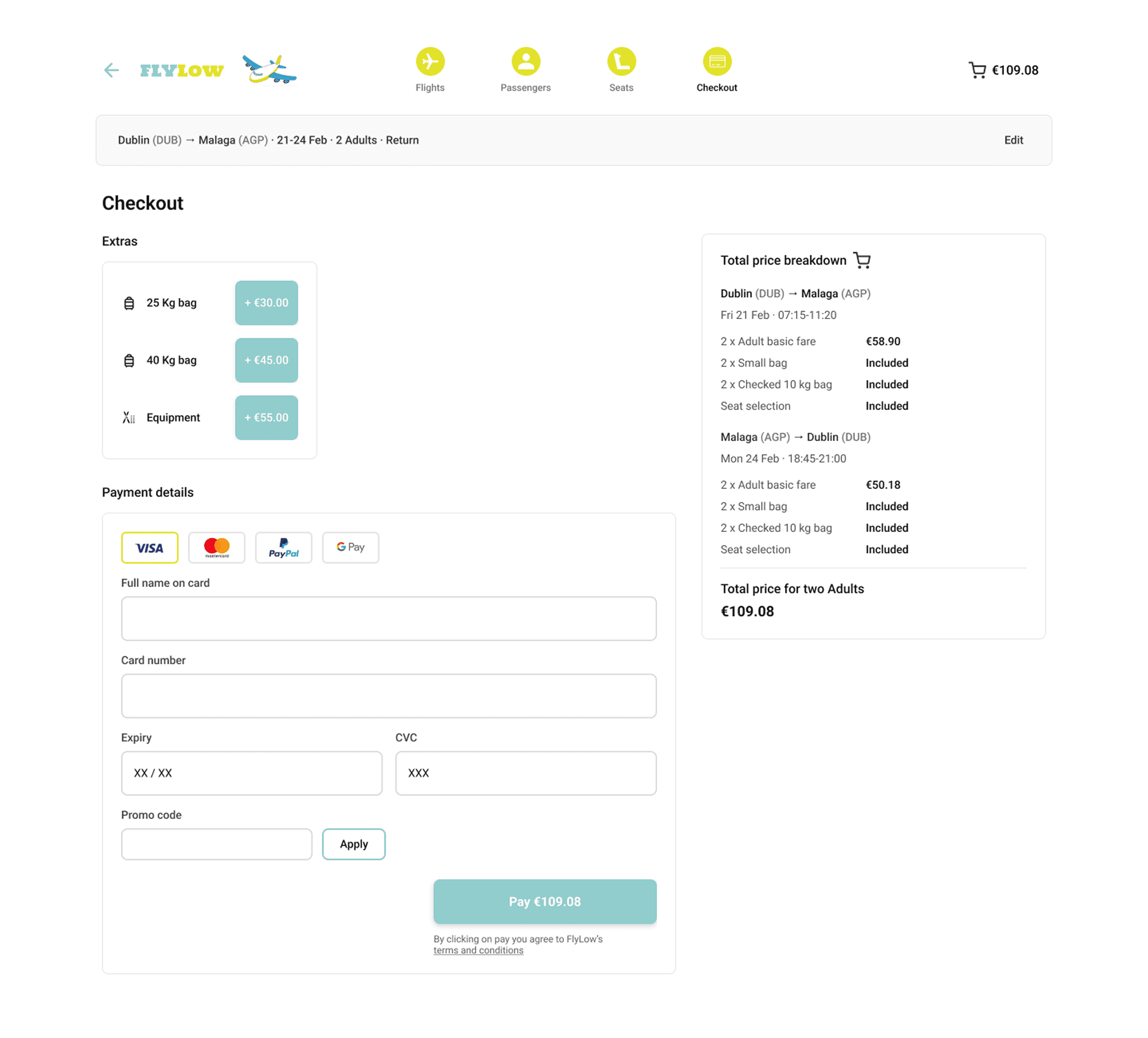 Extras and baggage grouped cleanly and above payment details, allowing users to finalize add-ons without being redirected or interrupted