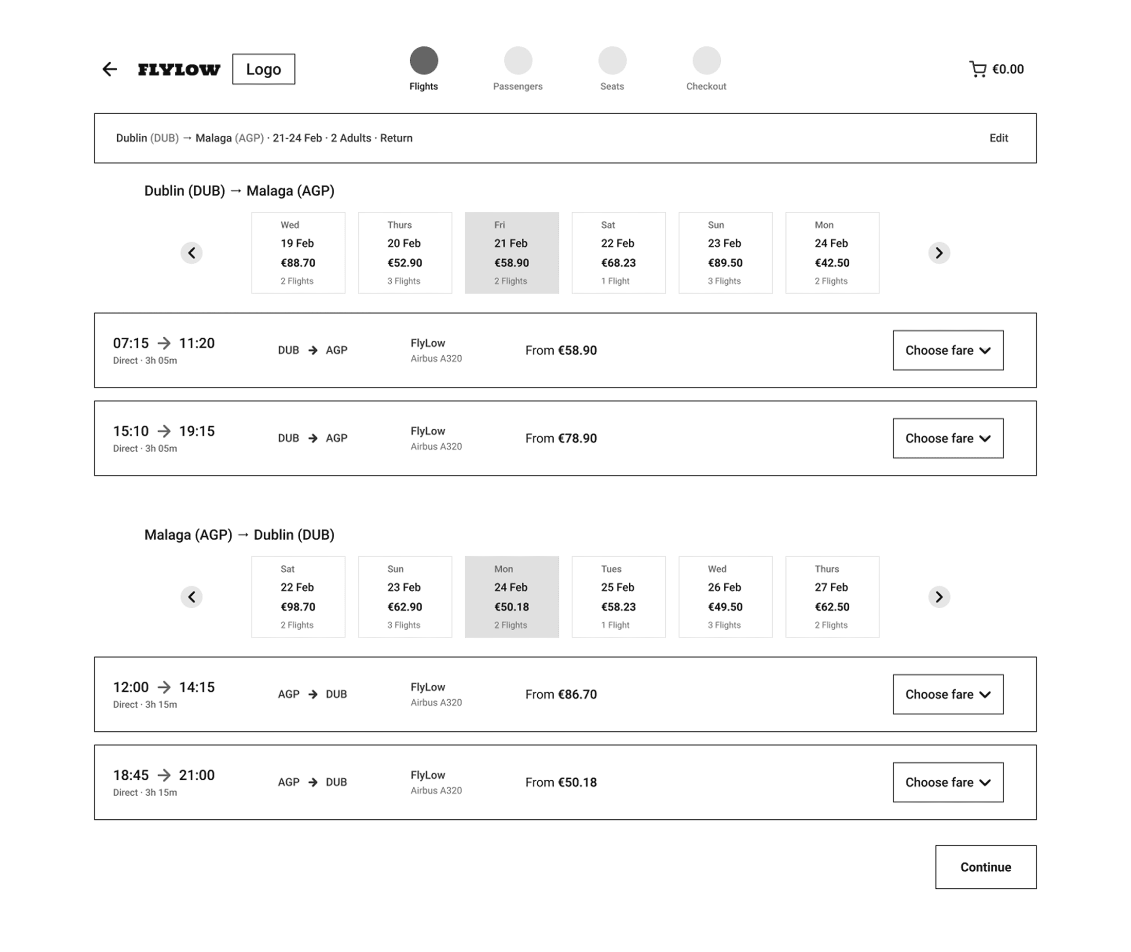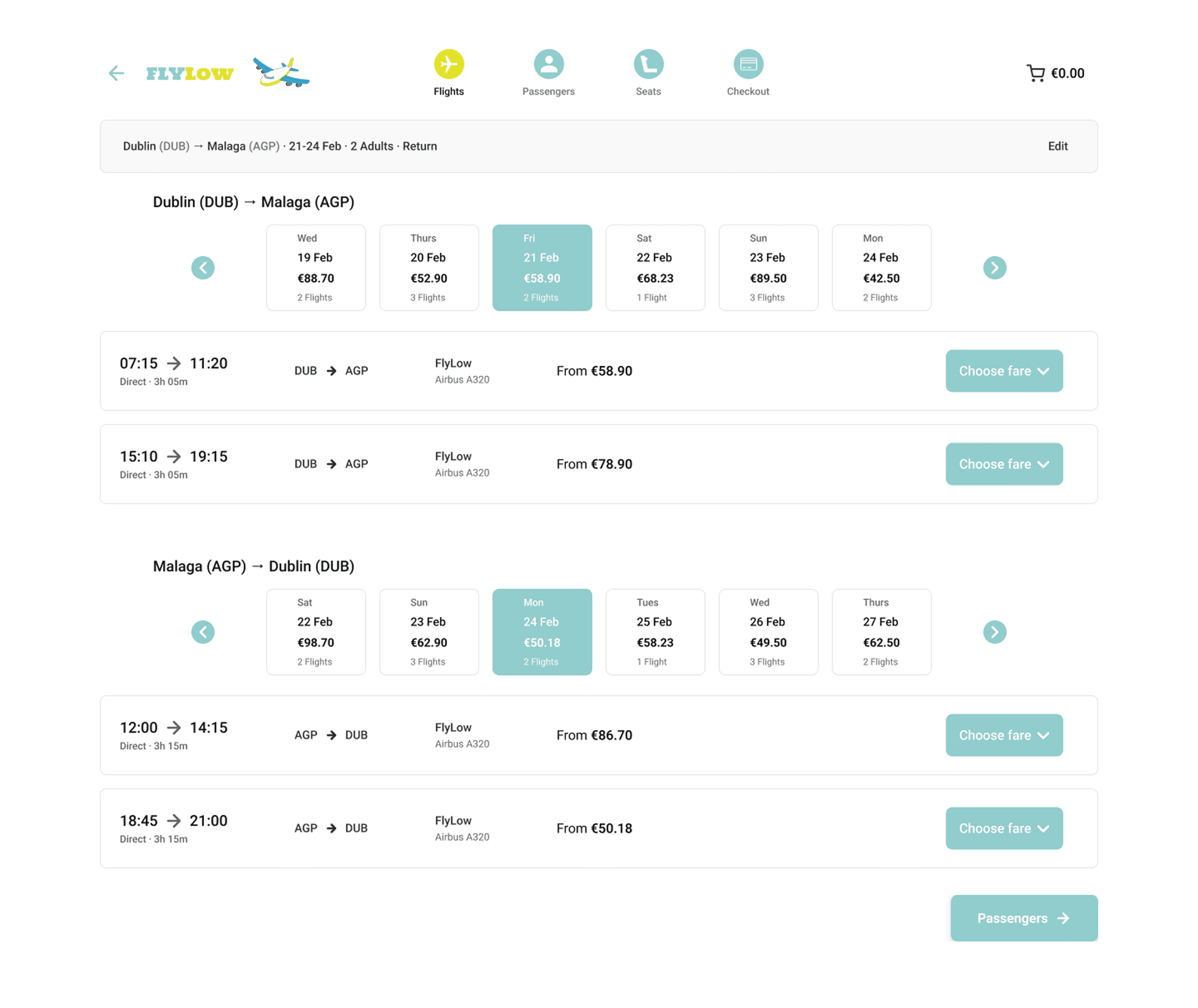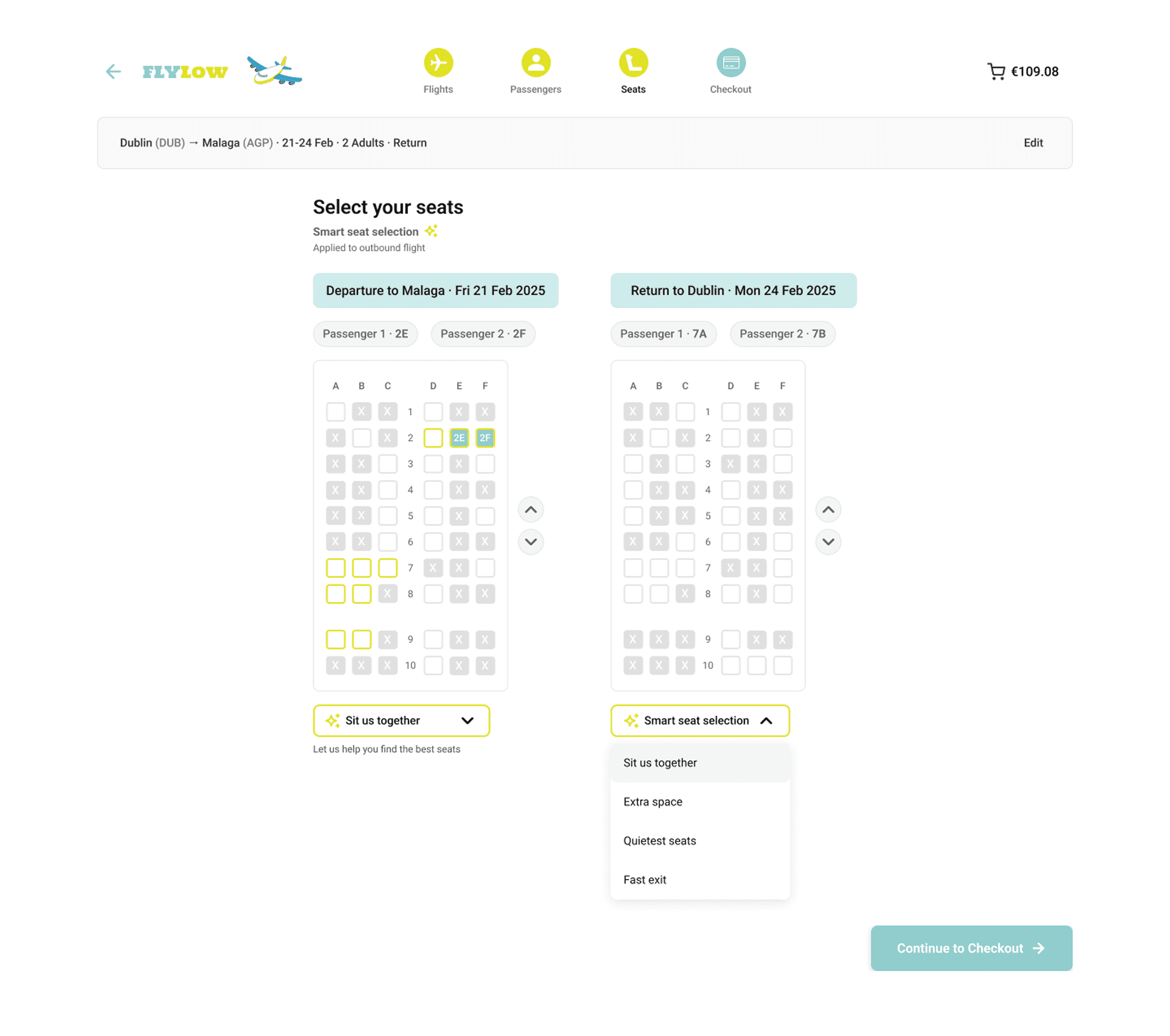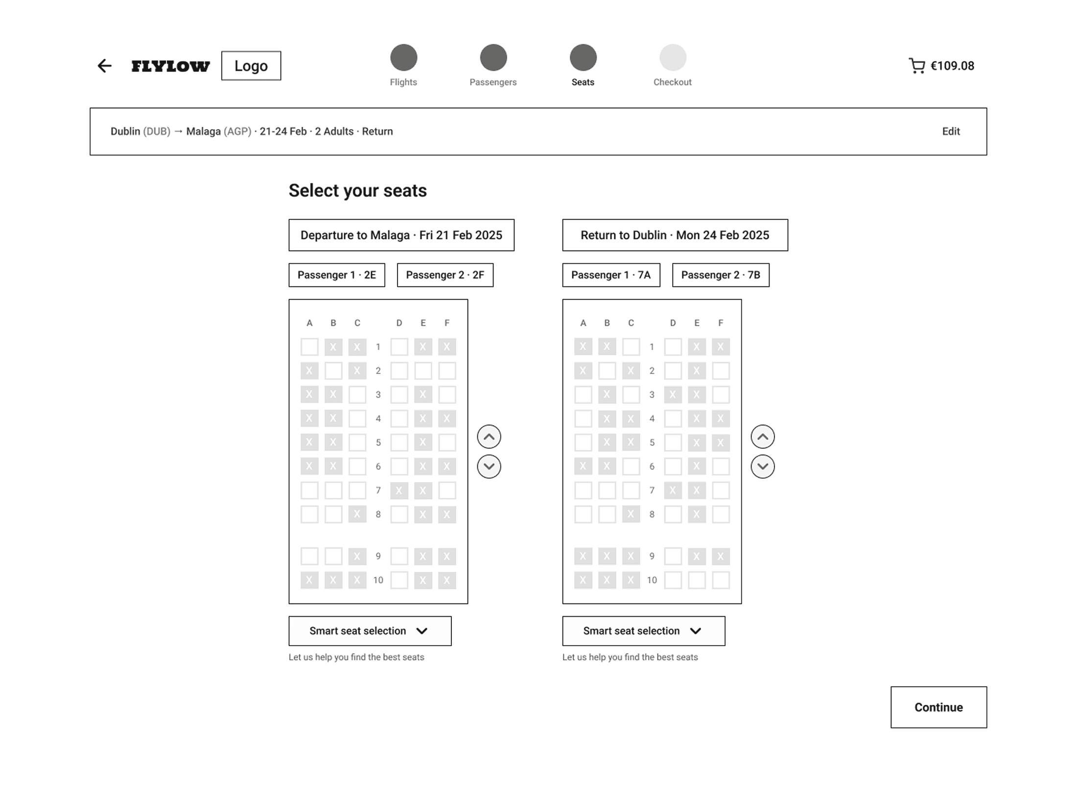 Outbound & Return seat map on the same screen so users don’t need to navigate to a second page — reducing clicks and speeding up completion