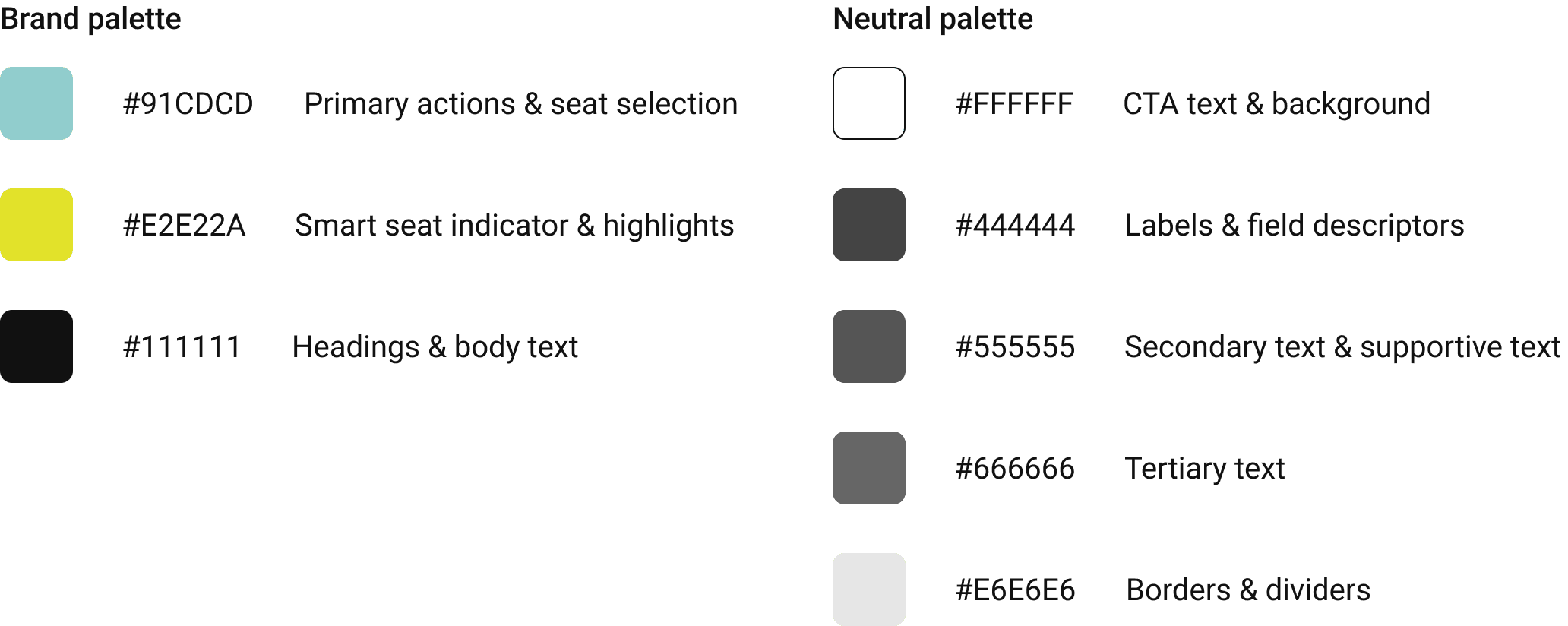 This palette emphasizes clarity and contrast, with brand colours used sparingly to guide action, and neutral greys supporting hierarchy and readability.