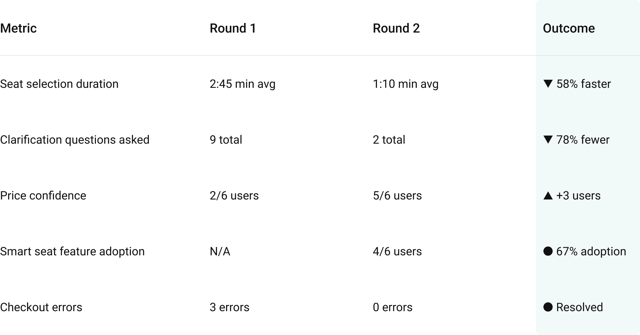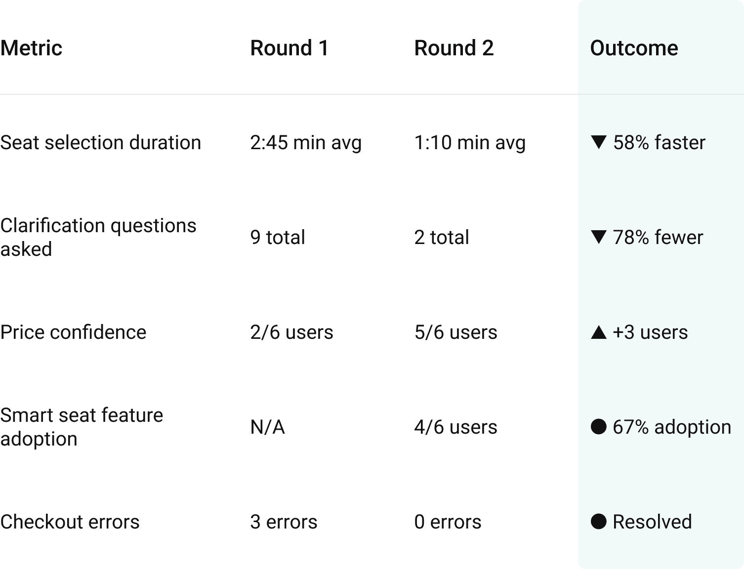 These insights informed final adjustments, including “Calmest Seats” to “Quietest seats” and making the full price breakdown visible at checkout without opening the basket.