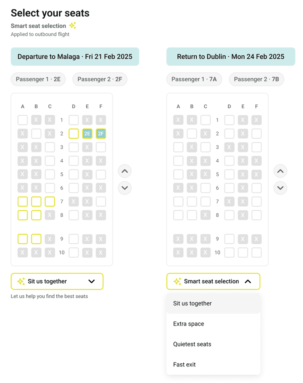 Dual seat maps on one screen let users choose outbound and return seats without extra steps, reducing interaction friction