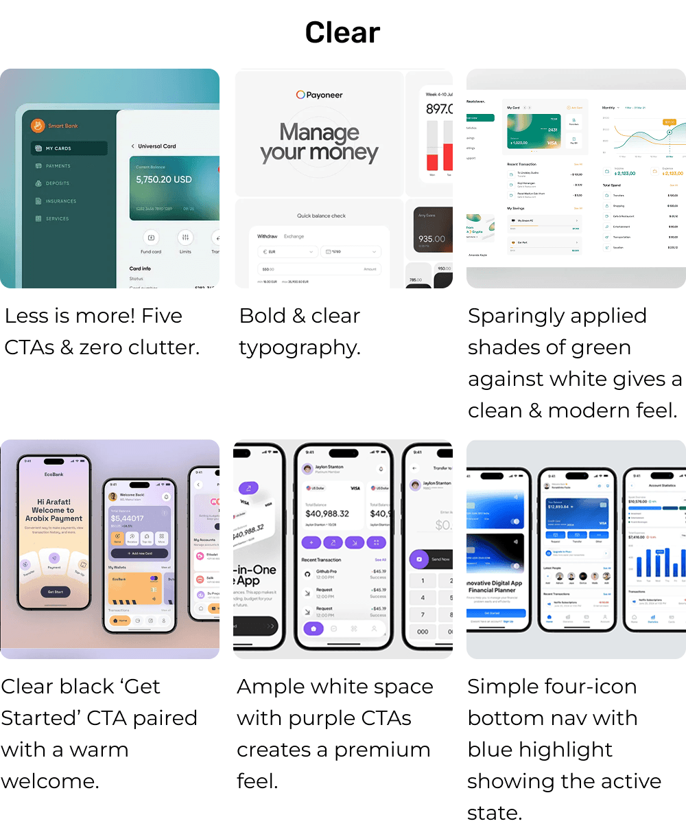 I created mood boards exploring the brand’s core tones (Clear, Playful, and Trustworthy) using colour, shape, typography, and UI references. These boards set the foundation for the final visual direction.