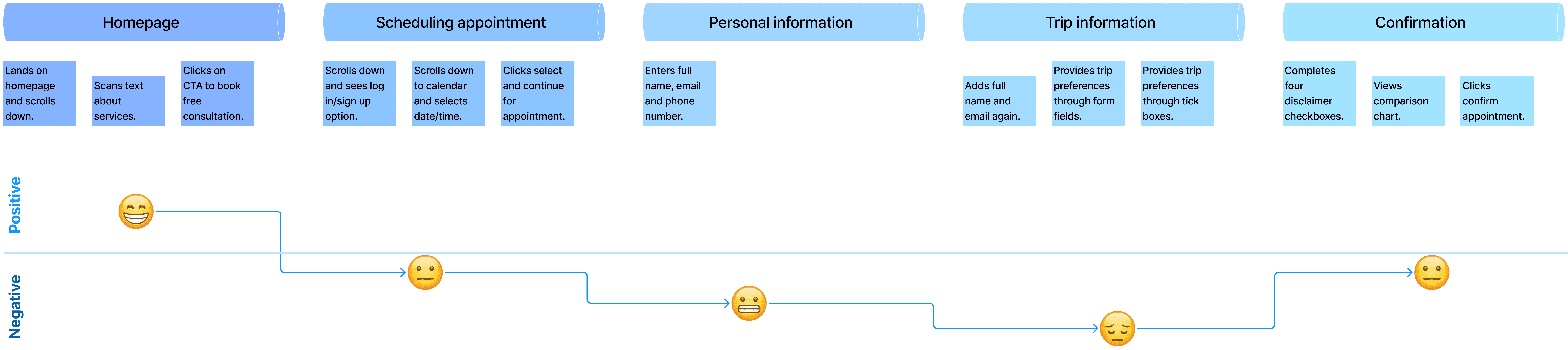 A snapshot of the user journey, showing emotional highs, friction points, and key moments during the booking flow.