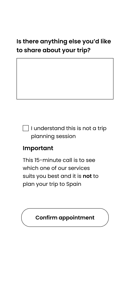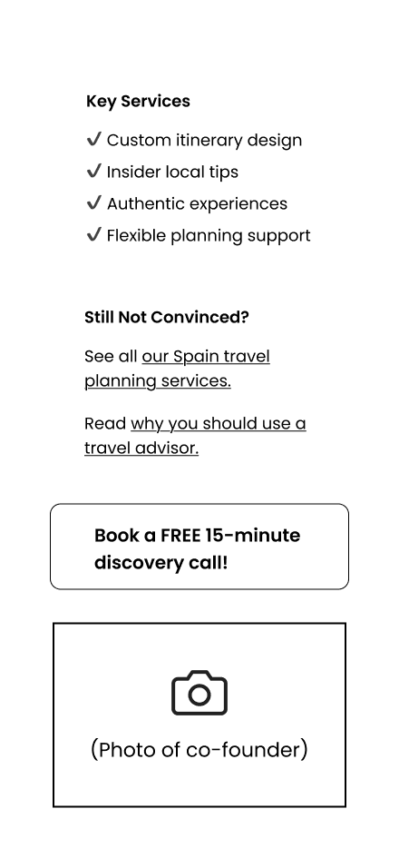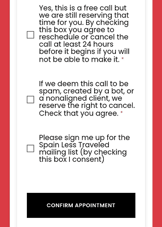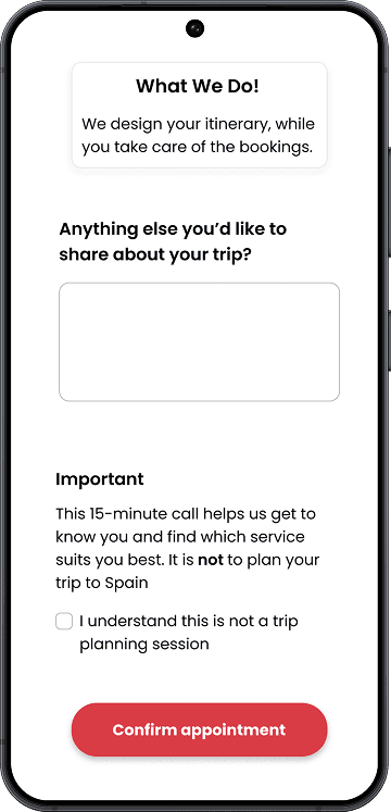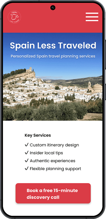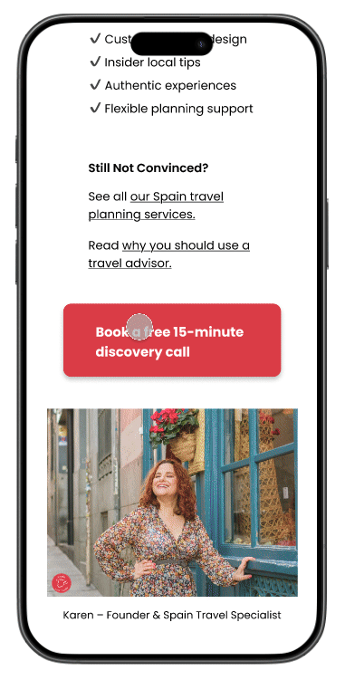 Spain Less Traveled is a boutique travel consultancy that designs custom Spain itineraries and relies on a free 15-minute discovery call to generate clients. With 85% of callers upgrading to a paid consultation, improving this mobile booking flow is critical for conversion and business growth.