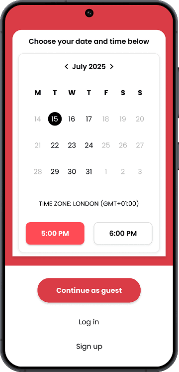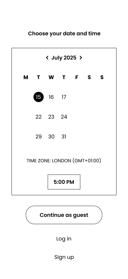 Based on this, I prioritised guest access as the primary action, with “Log in” and “Sign up” available as secondary options, improving completion while still supporting account creation later.