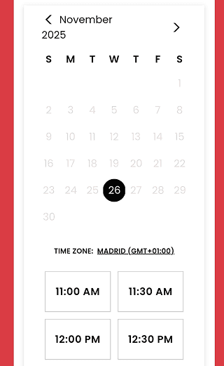 Instead of showing a full monthly calendar, the interface displays the next 21 available booking days, beginning from the earliest possible appointment. Since consultations are offered on three fixed days per week, this rolling window encourages users to book within the current availability cycle rather than spreading them across multiple months.