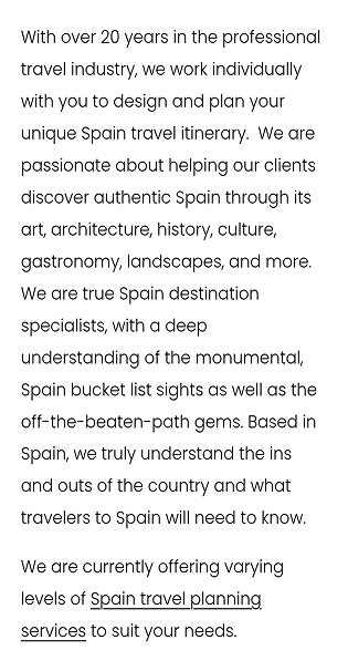 The site’s title, tagline, and imagery clearly conveyed the service focus — travel planning in Spain